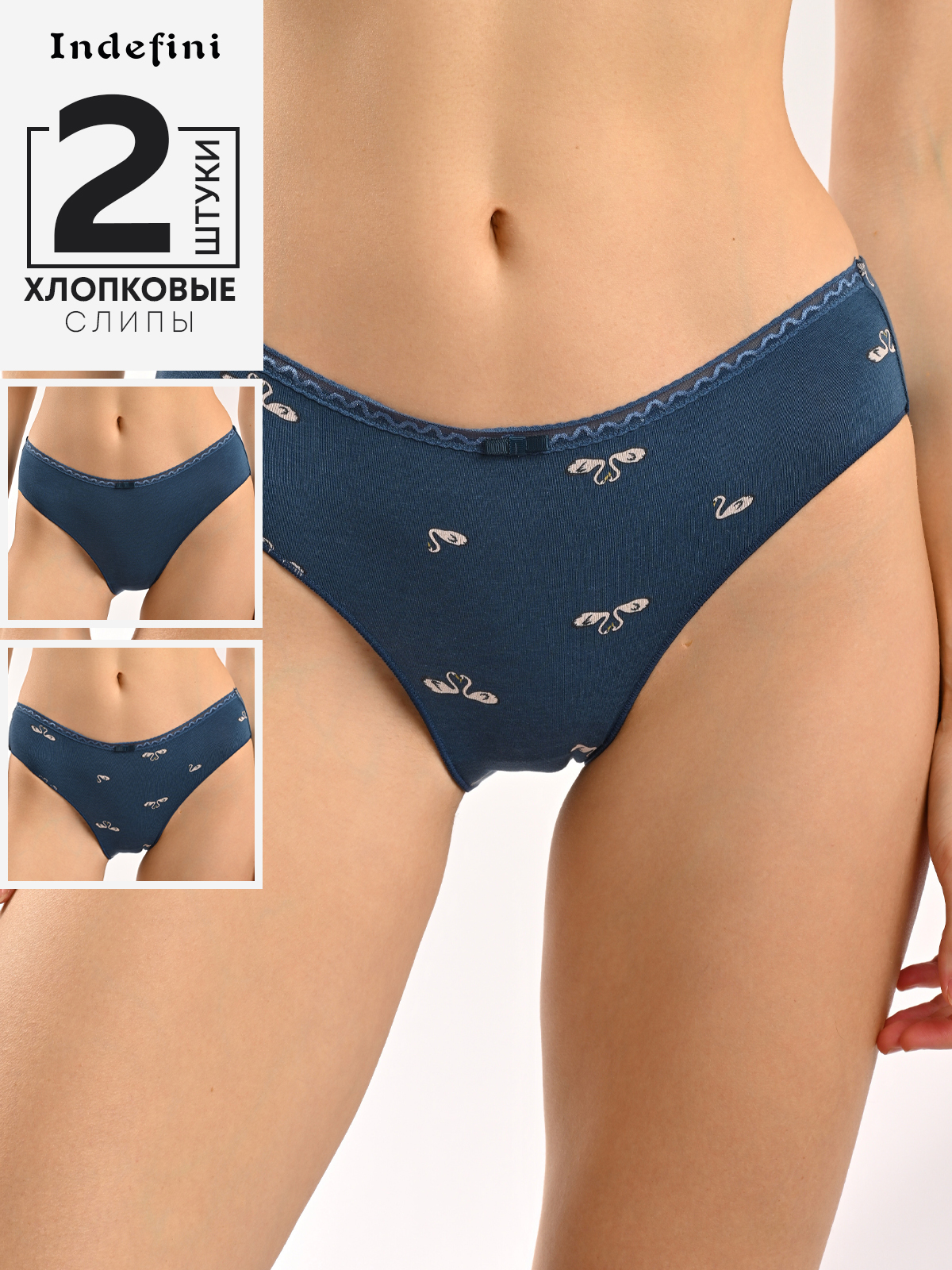 Повседневные женские трусы слипы. В комплекте 2 пары в универсальном синем оттенке. Мягкая резинка, средняя посадка — в таком белье комфортно в течение всего дня. Трусы сшиты из качественного трикотажа. В составе есть небольшое количество эластана — он делает белье долговечным и эластичным.