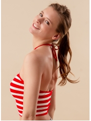 Женский топ от торговой марки Индефини. Топ выполнен из вискозы в тонкий рубчик, красно-белого цвета в полоску, без рукавов с регулируемыми завязками, укороченный.