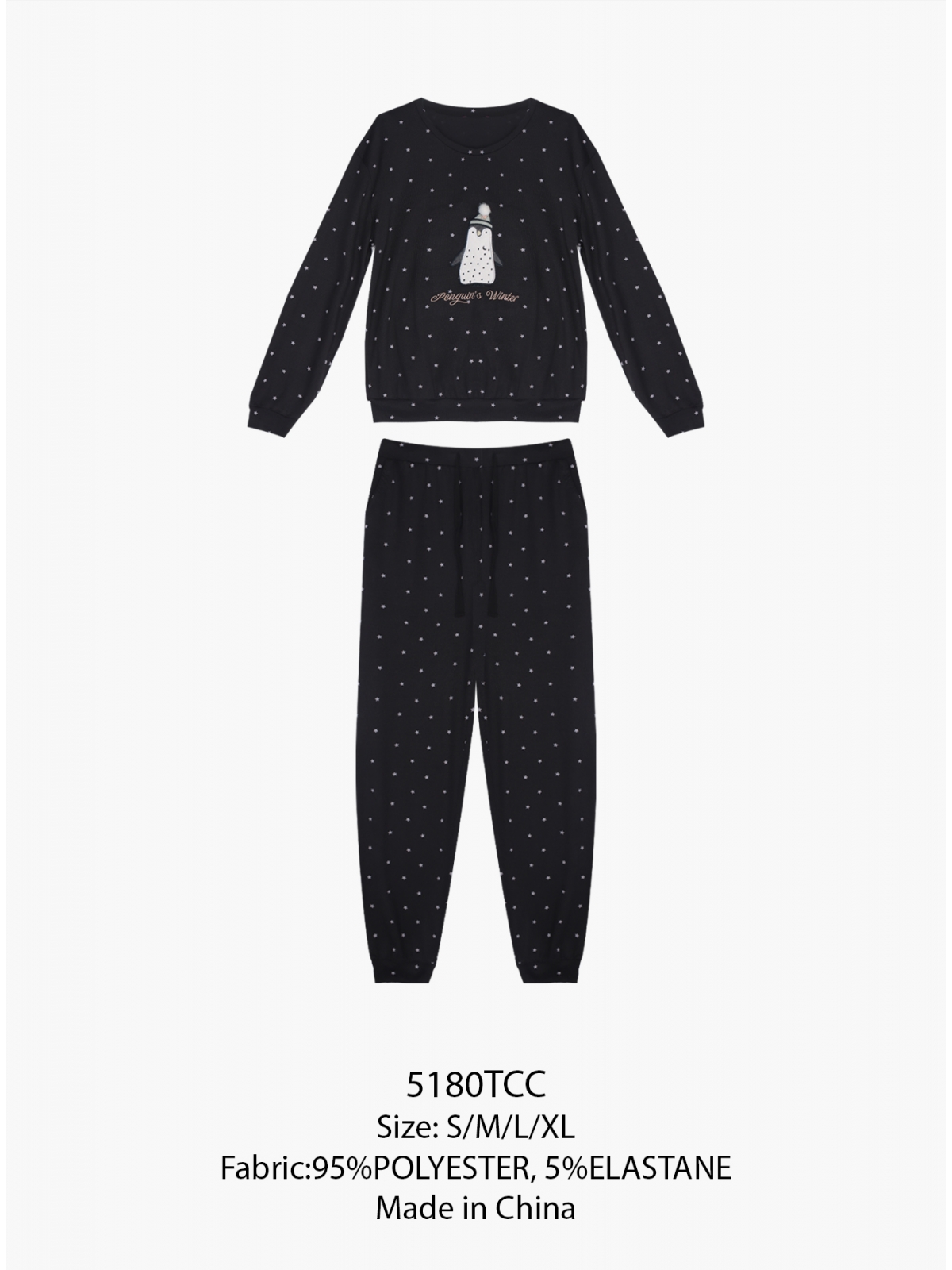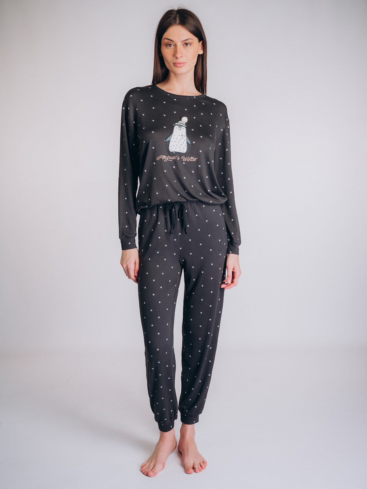 Женская пижама от бренда Indefini — это сочетание уюта, мягкости и зимнего настроения. Комплект выполнен в тёмно-сером цвете с изысканным принтом из мелких белых звёзд и изображением пингвина в шапке с надписью «Penguin’s Winter», что придаёт образу нотку тепла и игривости.