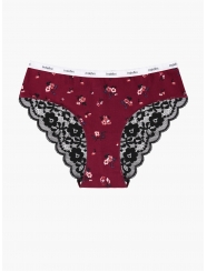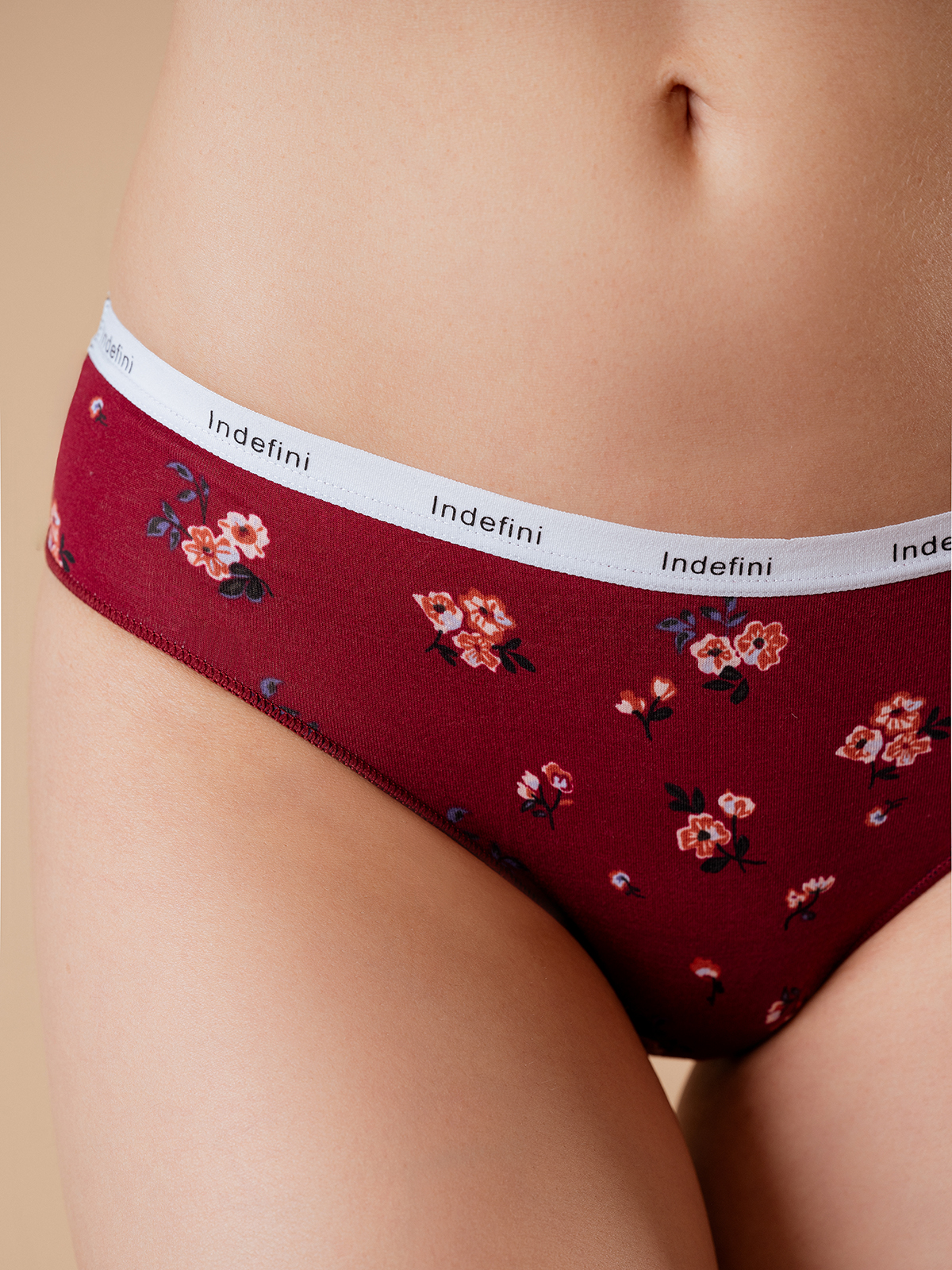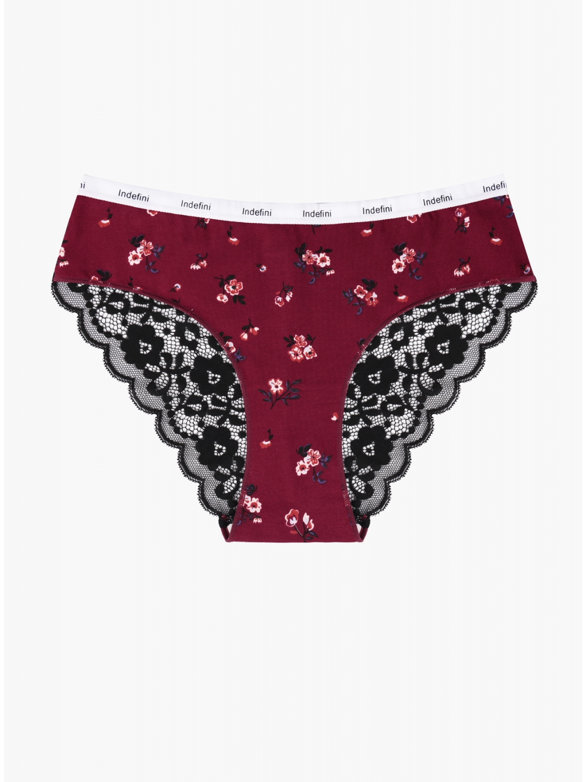 Женские трусы от торговой марки Индефини. Трусы-слипы из хлопка, бордового цвета, с цветочным принтом, с кружевной задней частью, на мягкой резинке, средней посадки.