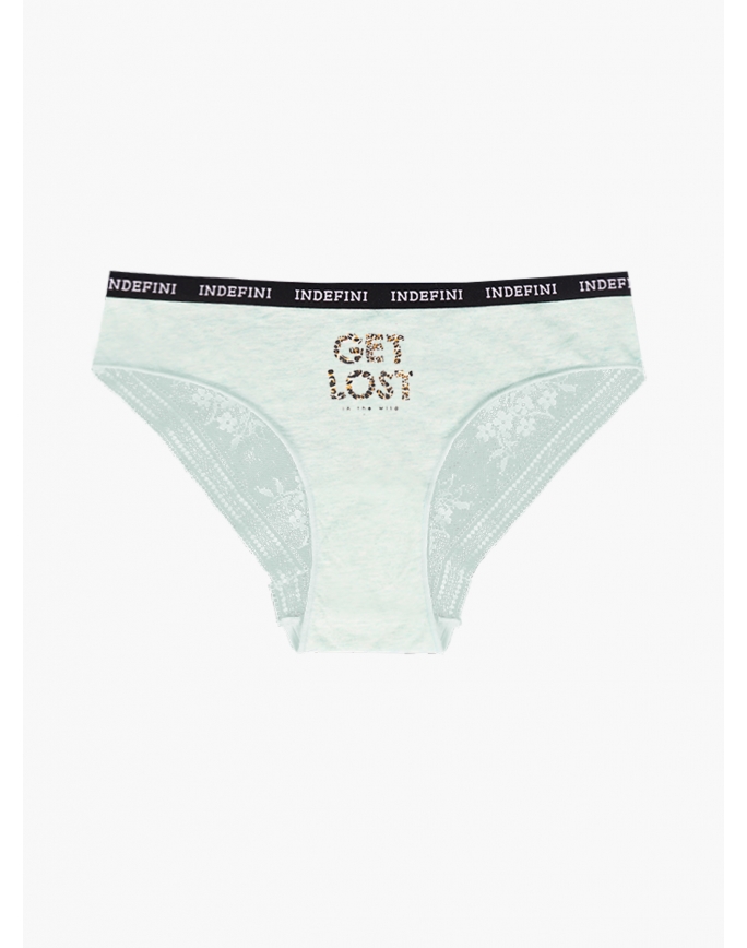 Женские трусы от торговой марки Индефини. Трусы-слипы из хлопка, зеленого цвета, с принтом, с кружевными вставками и обрамлением, с кружевной задней частью, средней посадки, на мягкой резинке.