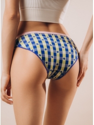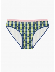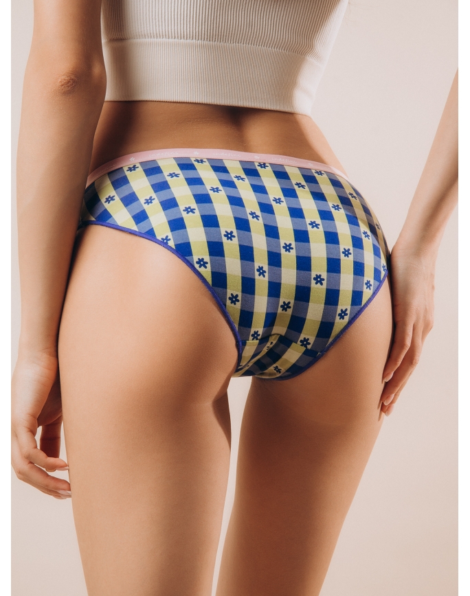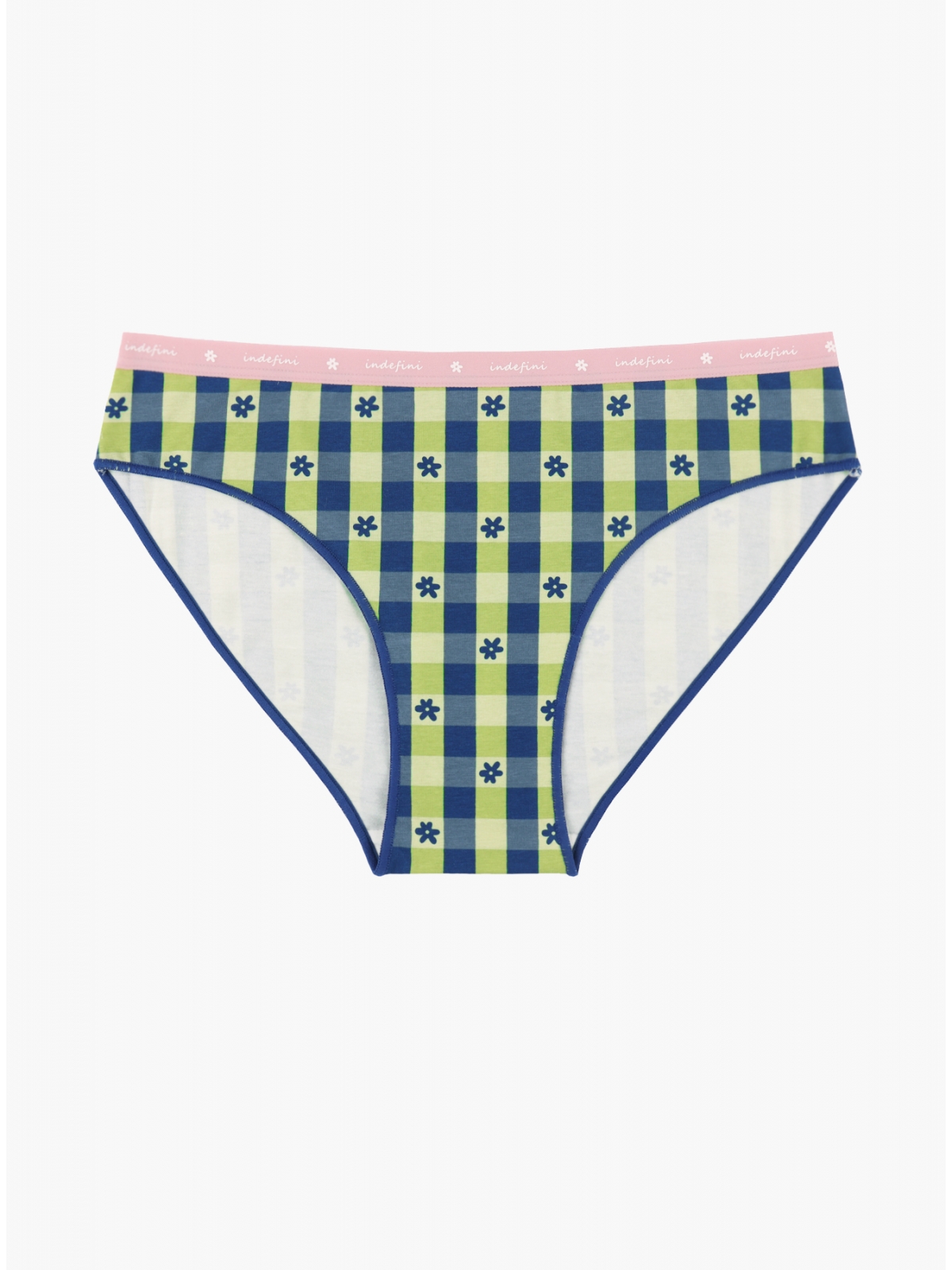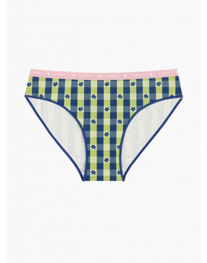 Трусы слипы женские, выполненные в зеленом цвете, изготовлены из хлопка. Трусы средней посадки имеют розовую мягкую резинку на талии с нанесенной на ней надписью «indefini». Трусы украшены принтом в клетку с изображением цветочков.