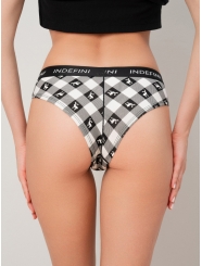 Женские трусы-танга, изготовленные из хлопка, надежно прилегают к телу благодаря мягкой эластичной резинке на талии. Хлопковый материал является дышащим и пропускающим воздух, что обеспечивает приятные ощущения при носке. Трусы украшены принтом в черно-белую клетку с изображениями оленей.