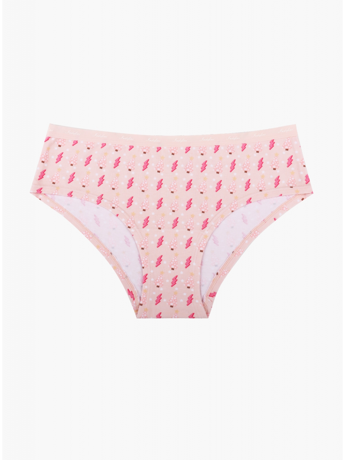 Трусы танга женские созданы из хлопка. Трусы средней посадки с мягкой резинкой на талии отлично сидят по фигуре, подчеркивая ее линии. Трусы танга женские украшены принтом с изображением елочек и молний.